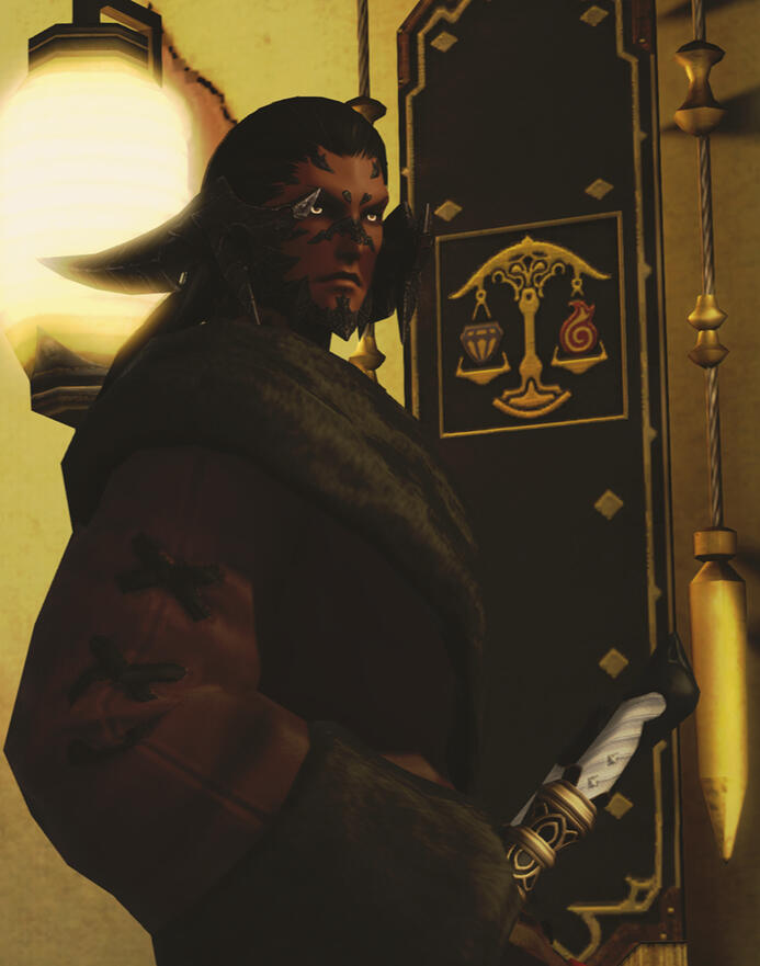 Not much is known about Jaskan's past but at least this much has been uncovered...His family comes from Thavnair but he was born and spent most of his childhood in Kugane, after his parents traveled with a circus troupe to escape their home (reasons unknown). As soon as he was old enough, he joined his family in the circus trade as a Knife Thrower (particularly skilled in the "Impalement Arts").After a strict upbringing that left him with various useful skills that he still uses today, Jaskan left home, and Kugane, for the Azim Steppe. There he found himself surrounded by Xaela like himself and he shed his family name in exchange for joining the Adarkim tribe. He took on their name as his own and left behind the family name that haunted him. While with the tribe, they helped him harness his anger and aggression into combat skills that he uses for his current occupation today. At the same time, the calm and open of the Steppe helped him to control his emotions and keep a level head in any situation.All of this leading him to a life of contract/mercenary work that affords him the ability to travel where and when he pleases, never staying too long in one place. He's traversed many regions, been contracted by all sorts, but now he's locked in a job with an unknown end.